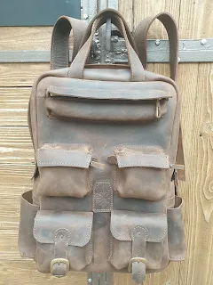 Un rucsac de dimensiuni considerabile, cu multiple buzunare aparente amplasate frontal, cît și lateral, realizat manual in intregime, din piele tăbăcită vegetal ceruită, grosimea materiei prime suficientă cât să nu aibă nevoie de întăritutură, dar care să-si mențină fermă poziția, în același timp să nu fie nici prea țeapăna,rigidă. O piele placută la atingere, o adevărată plăcere pentru mine ca artizan să lucrez cu ea, o piele care va îmbătrâni frumos, căpătând o patină unică.